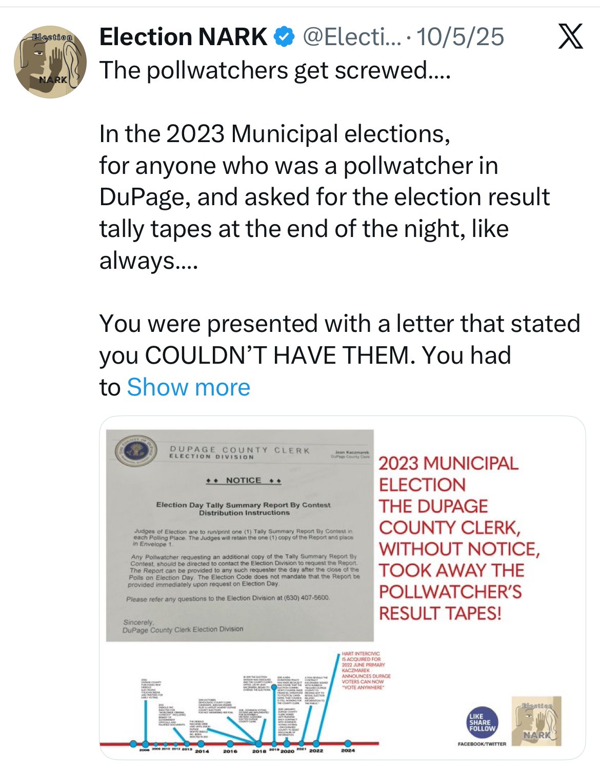 As reported by Election Nark: In the 2023 Primary, with no prior warning, poll watchers were shown a letter from the County Clerk that instructed Election Judges that they were no longer allowed to print tapes for poll watchers at the end of election night like they had always done according to the Illinois Election State Statutes.