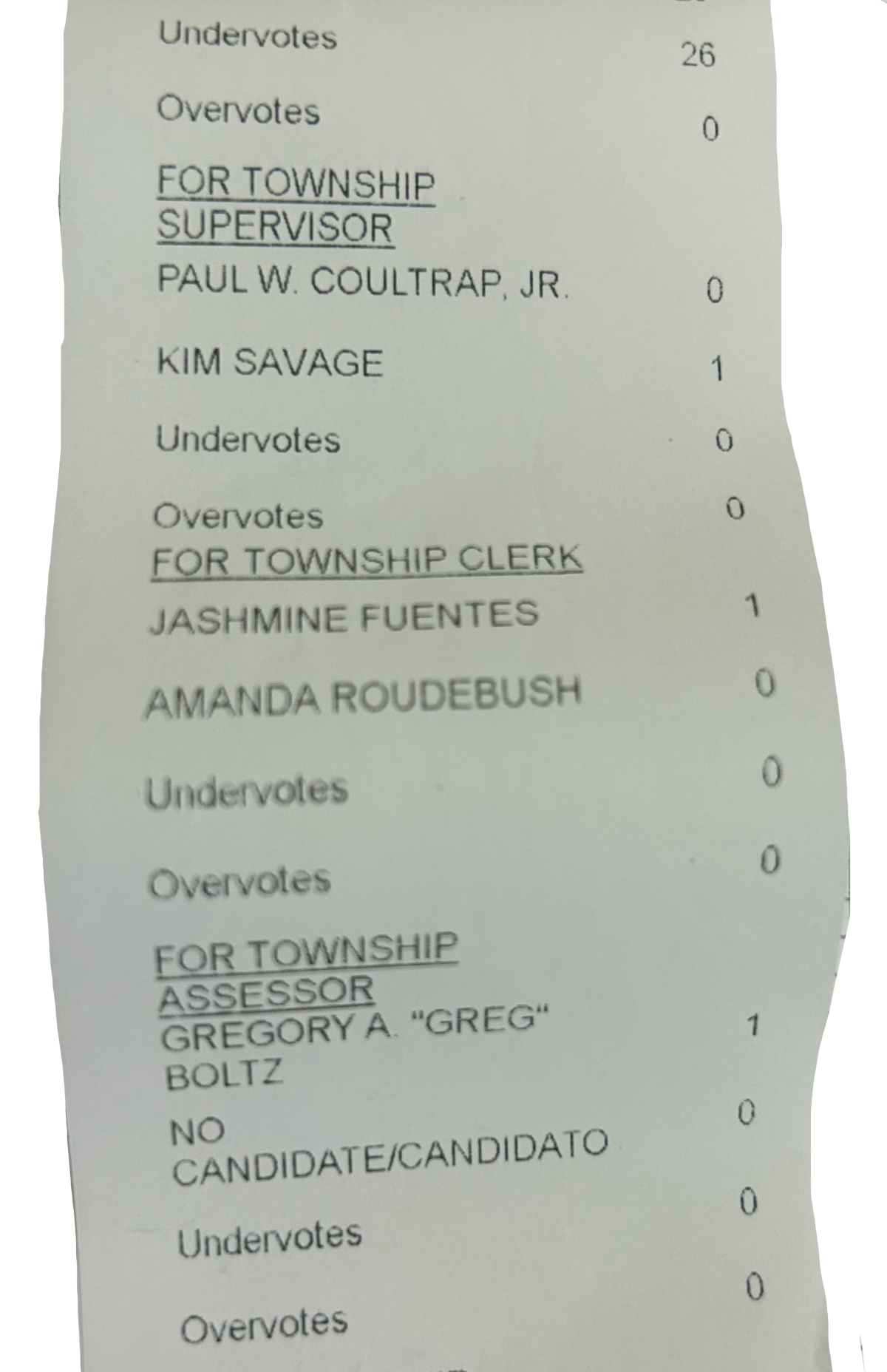 This is an actual example of what your vote looked like on an election results/poll tape or a canvass, if you were someone who voted outside your regular precinct from where you reside, where no one else had that same ballot style or candidates like you: